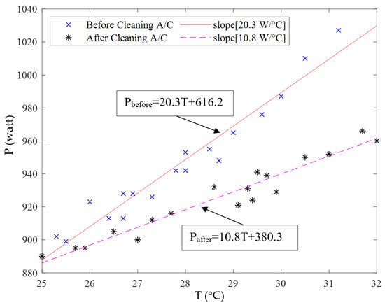 When the ambient temperature is higher, the air conditioner tends to consume more electricity, as shown in Figure 27. Some of this electricity is used for cooling. From the results of continuous data measurement using the NILM principle, the relationship between the temperature and power can be derived as shown in Figure 27. The same approach can be used to determine the optimum time to clean the air conditioner for better cooling.