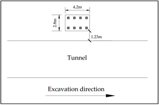 Tianjin Metro Line 3 is the city’s main metro line, alleviating traffic congestion and making transit more convenient for inhabitants. With a length of 33.7 km, the Tianjin Metro Line 3 was constructed using a shield Tunnel Boring Machine (TBM), as shown in Figure 1. The tunnel’s external and internal diameters are 6.20 and 5.60 m, respectively. The prefabricated section liner has a thickness of 0.35 m. In this study, a segment of Tianjin Metro Line 3 passes near the viaduct. The distance between the viaduct abutment and the tunnel is 1.23 m, while the distance between the pile foundation and the tunnel is 1.58 m. The abutment is supported by eight 0.35 m × 0.35 m square piles; the abutment’s dimensions are 4.2 m in length, 2.8 m in width, and 1.35 m in height. The abutment’s design allowable load capacity is 340 kN. Figure 2 shows the positional relationship between the tunnel and the pile foundation.
