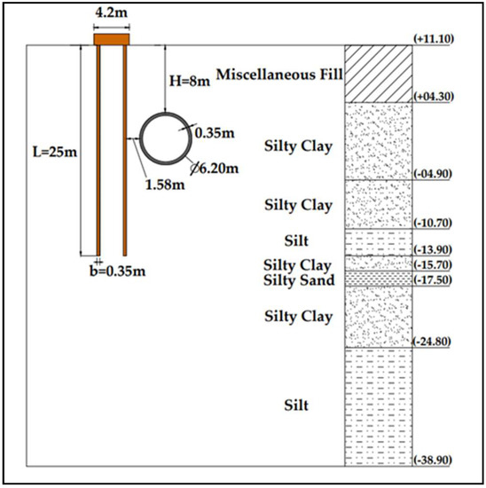 The Modified Mohr–Coulomb constitutive parameters of the weighted average soil layer are shown in Table 1. The coefficient of lateral earth pressure (ko) at rest is determined by Mayne and Kulhawy (1982) [43]. The natural gravity, cohesion c, friction angle φ, and Poisson’s ratio ν of the soil are calculated by mathematical equations. According to site survey data, the physical characteristics of the soil strata are summarized in Table 1.