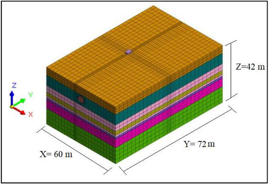 According to the Tianjin Metro Line 3 project overview, a certain section of the tunnel passes through the pile foundation of the viaduct abutment. A three-dimensional model is established to study the effects of tunnel construction on pile foundations using the Midas GTS-NX finite element package. Considering the boundary effect on the accuracy of the numerical results, the influence of tunnel construction on adjacent pile foundations is chosen to establish a 3D finite element model. In this study, the numerical model is shown in Figure 4. The mesh used in this model consists of 52,045 nodes and 49,075 elements. The mesh dimensions are 60 m (≈9.75 D) wide in the transverse direction, 72 m (≈11.75 D) in the longitudinal direction, and 42 m (≈6.75 D) deep in the vertical direction. Therefore, these dimensions are sufficiently large to minimize boundary effects in the numerical modeling because the massive raise in mesh size does not cause any change in the analysis results. In numerical modeling, the soil layer, tunnel lining, and cap are simulated as continuum solids while the piles foundation are simulated with beam elements, and the shield machine is considered as a continuum shell. The pile interface is set between the pile and the soil.