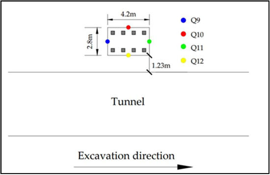 To ensure the authenticity of the calculation results and verify the validity of the 3D model, it is necessary to compare the on-site monitoring data with the settlement values of the monitoring points in the simulation calculation results. In order to monitor the displacement of the bridge abutment and construction safety during the tunnel construction, four monitoring points were arranged above the bridge cap to observe the horizontal and vertical displacements as shown in Figure 5.