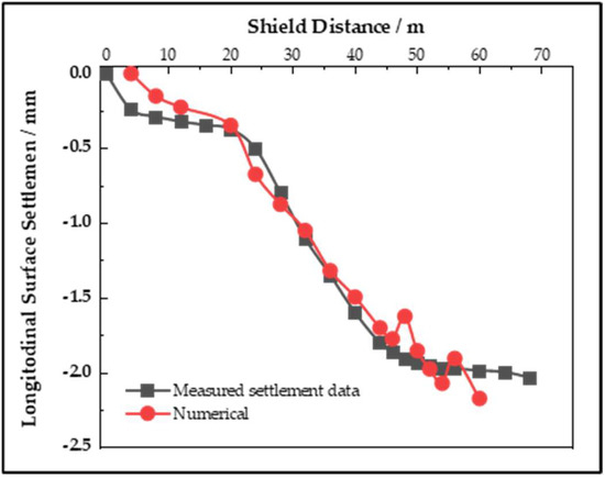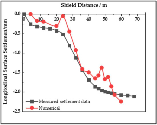 The comparison between the measured settlement data and the vertical displacement in the numerical simulation of Q9 and Q12 points is shown in Figure 6 and Figure 7, respectively. It can be seen from the two figures that the impact of shield construction on the pile foundation is mainly within the range of twice the tunnel diameter from the front and back of the tunnel face to the pile foundation. Additionally, the settlement at this stage accounts for about three-quarters of the total settlement. Numerical calculation results are slightly different from actual measured data, which verifies the validity of the model parameters selection and working condition settings, and the authenticity of the calculation results.