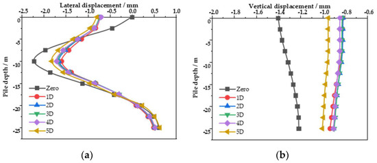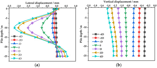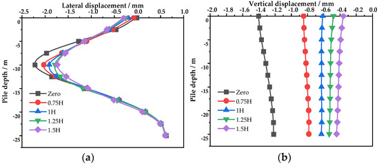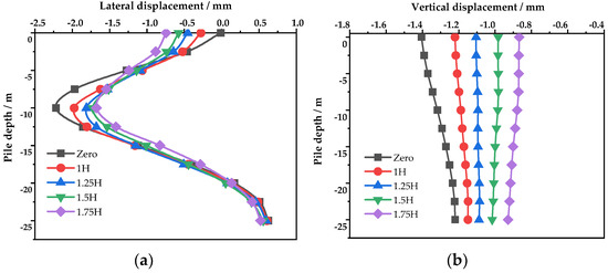 The displacement of the pile under different distances between the isolation pile and the tunnel: (a) lateral displacement; (b) vertical displacement.