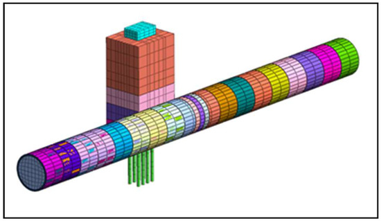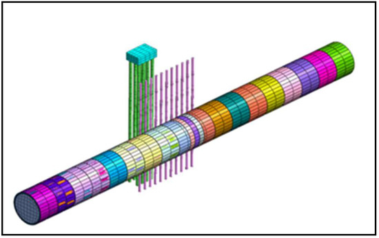 In this study, the grouting reinforcement is simulated by changing the soil properties within 2 m of the pile circumference. The elastic modulus of the soil after grouting is taken as 300 MPa. The depth of grouting reinforcement is respectively taken as 0.75 H, 1 H, 1.25 H, and 1.5 H, where H is the average buried depth of the tunnel center-line, so H is 11.1 m. The soil reinforcement analysis model around the pile (soil mesh groups are hidden) is shown in Figure 9.