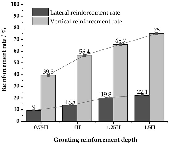 The displacement reinforcement rate of the pile under different grouting depths.