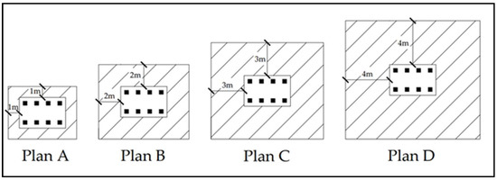 The scope of grouting reinforcement refers to grout in the different areas around the abutment, which is divided into four different grouting reinforcement areas in this study. Determining different grouting areas by a different arrangement of grouting holes, the design of plans is shown in Figure 12. The grouting reinforcement depth is 1.25 H.