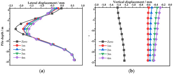 The displacement of the pile under different isolation pile lengths: (a) lateral displacement; (b) vertical displacement.