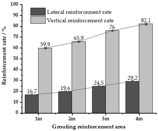The histogram of the pile’s lateral reinforcement rate and vertical reinforcement rate in the case of different grouting reinforcement areas is shown in Figure 14. The lateral reinforcement rate of piles increases with the increase of the grouting area and reaches the maximum when the reinforcement area is 4 m. The maximum lateral reinforcement rate is 82.1% and the maximum vertical reinforcement rate is 29.2% for each increase in the grouting area. The lateral reinforcement rate increases by 4.17%, and the vertical reinforcement rate increases by 7.4%.