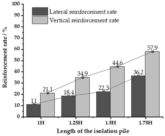 The displacement reinforcement rate of the pile under different lengths of the isolation pile.