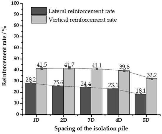 The displacement reinforcement rate of the pile under different spacing of the isolation pile.
