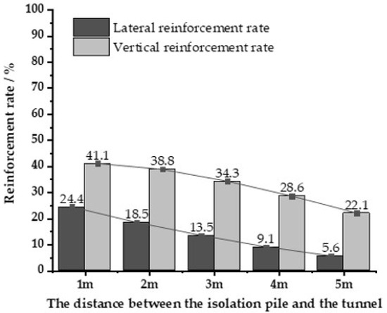 As shown in Figure 21, the pile reinforcement rate decreases as S increases, and the lateral reinforcement rate changes from 41.1% to 22.1%. The vertical reinforcement rate of the pile foundation has changed from 24.4% to 5.6%. Therefore, when the isolation pile is used for reinforcement, the closer the isolation pile is to the tunnel, the better the reinforcement effect.