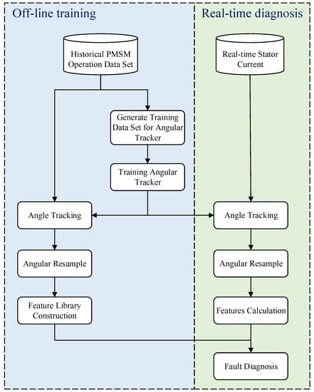 Among many PMSM fault diagnosis methods, frequency-domain features are the most common and simplest fault features used. However, these features have a great disadvantage, that is, they cannot work under nonstationary conditions [10], and when used in multiple operating conditions, a large number of samples are needed to learn features. The basic idea behind such a method is that the fault frequency of the motor is proportional to the fundamental frequency of the stator current; thus, when the fundamental frequency of the stator current changes under different operating conditions, the frequency domain features will also change accordingly. In order to solve this problem, researchers have proposed some methods based on signal decomposition. For example, in [11], the stator current under transient conditions is decomposed into the fundamental signal and the residual signal, and the root mean square (RMS) of the residual signal is used as the feature to detect ITSF. This method can realize motor fault detection under multiple operating conditions, but the RMS of decomposed signals cannot distinguish the types of faults. Another solution is to use order tracking. At present, order tracking is one of the commonly used techniques in multi-condition fault diagnosis. It changes the sampling rate in real time to ensure that sampling occurs at fixed-angle intervals, so as to keep the frequency-domain feature distribution of sensor signals unchanged under different operating conditions. The real-time adjustment of the sampling rate requires the cooperation of the sensor, which is suitable for rotating machinery [12]. However, order tracking based on hardware is not suitable for analysis of the stator current, so a computed order tracking method is needed.