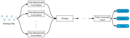 After generating the training sequences, the next step is to build a CNN-based phase tracker. The framework for the proposed CNN-based phase tracker is shown in Figure 2. The inputs of the CNN model in the training phase are the sequences generated by Equation (2), and the inputs in testing phase are the real-time stator current signals fed back by the sensors. The input signals are passed through the CNN, then three outputs are obtained, corresponding to the amplitude, frequency, and phase of the fundamental frequency of the input signals. The model consists of several convolutional layers and pooling layers stacked to form the former CNN part, and then the fully connected layer as the output layer. In the sequences generated, the larger the amplitude and frequency intervals, or the greater the noise, the more convolutional and pooling layers are required, according to experience. The activation function used by all neurons in the model is rectified linear units (ReLU), and the loss function is the sum of the mean square error of the three outputs that are normalized between 0 and 1. It is worth noting that phase trackers are not necessarily built using only CNN models; other neural networks can perform the same function. Compared with other neural networks, CNN has fewer parameters and a faster training speed, so the CNN model was chosen in this work.