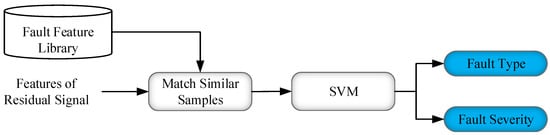 The motor fault diagnosis procedure is divided into fault detection, fault classification, and fault severity prediction. After establishing the fault feature library with a small number of samples, motor fault detection and classification can be realized by matching features between the real-time stator current and the fault feature library. In the case of the fault severity prediction, it is necessary to learn the relationship between the fault frequency amplitude and the fault severity from the data. In an SVM model, the kernel function can map the complex nonlinear relationship, while having a certain smoothing effect. For this reason, the SVM model is used for the fault severity prediction, as shown in Figure 3. The real-time stator currents are first fed into the phase tracker. After completing the signal resampling, the FFT of the residual signals is performed, and then several similar samples can be found in the fault feature library. These similar samples and residual signals are fed into the SVM model for further determination. The specific diagnostic steps are shown in Algorithm 1.