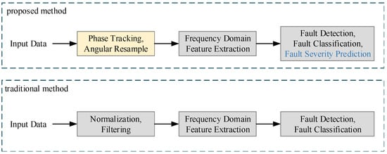 Compared with traditional PMSM fault diagnosis methods based on frequency-domain feature analysis, the proposed method features two key components: the phase tracker and angular domain resampling, in which the phase tracker can be executed quickly after off-line training, whereas the angular domain resampling step cancels the interpolation algorithm to improve execution speed, so it can maintain the same level of timeliness as the traditional method. In constructing the fault feature library steps, the signals’ fundamental frequency is adjusted to a same value after sampling; thus, it is not necessary to use a large number of fault samples under different operating conditions, as in traditional methods. Only the minimum speed, maximum speed, and small samples of other speeds under fault conditions are needed. The proposed method reduces the demand for fault samples, and at the same time improves the generalization ability. Figure 4 shows an illustrative comparison between the proposed method and traditional methods. In the next section, experimental verification and further analysis are carried out using simulation data.