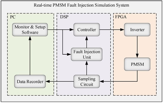 The experimental data were collected from a real-time PMSM fault injection simulation model, which was built on a hardware-in-the-loop (HIL) simulation platform. A schematic diagram of the simulation system is shown in Figure 5. It consisted of three parts, in which a computer was used to set parameters, control the simulation process, and record and display data. DSP performed PMSM control and the fault injection program; the inverter and motor models were implemented by the field programmable gate array (FPGA). During the simulation, all relevant parameters were set using the setup software in the computer, and then the motor control commands and fault injection commands were sent to the DSP controller. The controller generated corresponding driving signals to the inverter instantly, so the PMSM could output corresponding signals on the stator current, rotational speed, torque, etc. During the simulation process, all output signals of the PMSM were fed back to the controller and its computer through the sampling circuit.