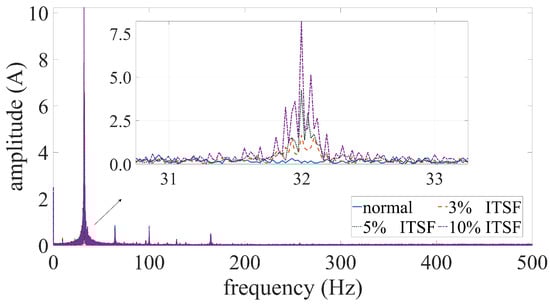 Figure 7 shows the stator current spectrum of ITSF with four different fault severity levels under 500 r/min. It can be seen that the amplitude of the third harmonic increased with the aggravation of the fault, but was relatively small compared with the fundamental frequency amplitude.