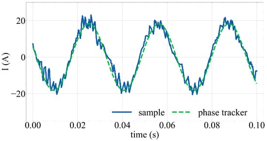 After the CNN model is trained using the stochastic gradient descent method, actual motor data or simulation data are used for testing. In the stator-current data used for testing, the amplitude should be within , the frequency should be within , and the noise amplitude should not exceed the maximum noise added when generating the phase tracker training dataset. As long as the stator-current data used in the test are within the previously defined range, the phase tracker can accurately output the amplitude, frequency, and phase of the stator current’s fundamental wave.
