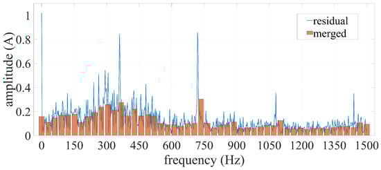After the residual signals were obtained from Equation (4), FFT was applied to obtain the residual spectrum. Considering that when ITSF occurs in PMSM, the fault frequency is an odd times of the fundamental frequency, and that resampling also has certain errors, all components less than 1500 Hz were retained in the residual spectrum. As mentioned above, in order to make up for the spectral error caused by angular domain resampling, the spectral coefficients were divided into ranges and combined. In this experiment, the rotating speed distribution was not wide, so the error caused by resampling was very small, and the width of the range was set to 30. That is, every 30 spectral coefficients were averaged once, and the resulting mean sequence was taken as the spectral features. Figure 11 presents an example of segmenting and merging operation, in which the number of coefficients is greatly reduced, which can eliminate the errors caused by resampling and noise to some extent. In addition, the amplitude of the fault frequency is not only related to the severity of the fault, but is also related to operating conditions of the motor. Therefore, the fundamental frequency amplitude and frequency obtained by the phase tracker were added as the residual features.