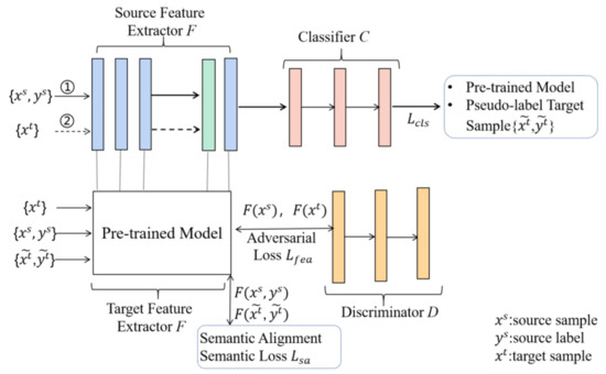 where denotes the volume of samples in each batch, and represents a learning rate. In class center semantic alignment, we need to know the pseudo-label of a sample in the target domain to obtain center alignment. We define as the probability in which belongs to the c-th class. We get the pseudo labels by the following steps. Firstly, the model is trained with the labeled data in the source domain. Secondly, we predict the labels of the target domain by the use of the trained model. The pseudo label corresponding to sample is calculated by . The class label of is determined by the label with the maximum probability.