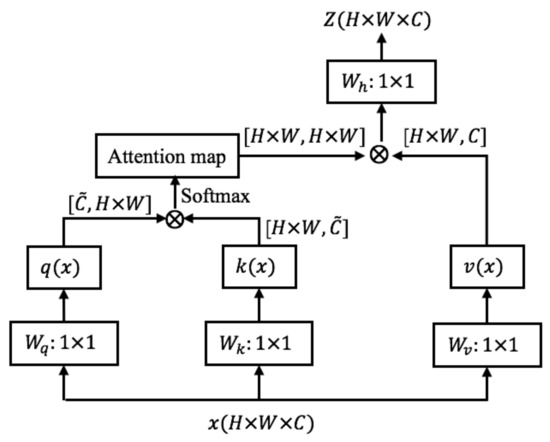 Figure 3 illustrates the workflow of the self-attention module. In the self-attention module, the feature map x is firstly obtained by convolution from the front few layers of the residual network. Furthermore, three feature maps , , and are obtained by three convolution, respectively. During the process of obtaining feature maps, the dimensions of and remain identical; only the channel value changes, while keeps the same dimensions and output channels unchanged. Then, we transpose and multiply it by . The attention map of [H × W, H × W] is obtained by normalizing each row by the Softmax layer. Multiplying the attention map by , we can obtain a feature map [H × W, C]. Then, processing it by a convolution, the output h is reconstructed as [H × W × C]; then, we can obtain the feature map .