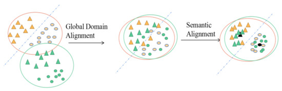 Currently, most of the existing domain adaptation-based malware classification methods focus only on global distribution alignment. However, global alignment alone does not achieve precise alignment. As shown in Figure 4, after global alignment, the source and target domains achieved global alignment, but there are still some misclassified samples. To make similar samples more compact, Weston et al. [36] calculated the distance among samples in the manifold embedding space and minimized this distance, but this requires a high computational cost. To reduce the computational cost, Wen et al. [37] calculated the absolute distance between each sample and its commensurable class center.
