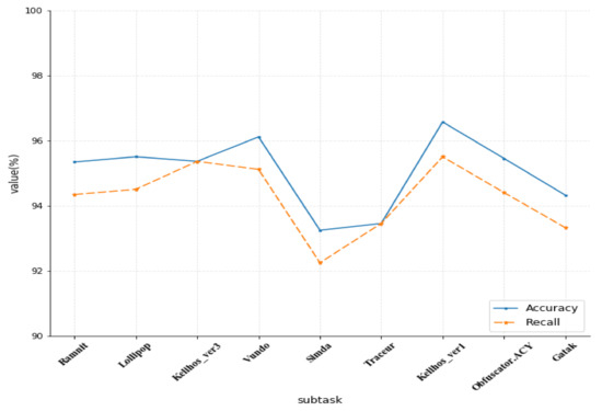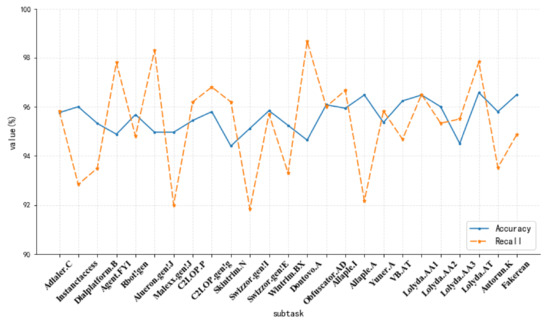 In this paper, we have run extensive experiments and calculated four evaluation metrics mentioned above when each family acts as an unknown malware (target domain) on the two datasets. We also take into consideration that one dataset (e.g., BIG-2015) is treated as the source data, and another (e.g., Malimg) is the target data. In the experiments, the benign software used in the source and target domain is distinct, too. Figure 5 and Figure 6 illustrate the experimental results. We can see that we achieve good results with our approach for each subtask. We averaged the results over several tests to obtain an average accuracy and recall of 95.04% and 94.25%, respectively on the BIG-2015 dataset, and the average accuracy and recall on the Malimg dataset are 95.63% and 95.30%, respectively.