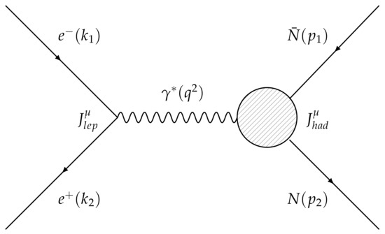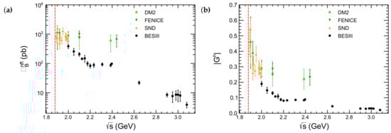 - Lees, J.P.; BABAR Collaboration. Study of e+e-→pp¯ via initial-state radiation at BABAR. Phys. Rev. D 2013, 87, 092005. [Google Scholar] [CrossRef] [Green Version]