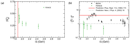 The reconstruction of the signal utilizes the characteristical unbalanced energy deposition from the neutron and anti-neutron in the EMC, respectively, and the non-zero event momentum. Cosmic rays background is significantly reduced with the moun detection system and the penetration depth within the EMC. Beam-related and physical background events are rejected with the EMC. The reconstructed events still contain a large fraction of cosmic ray background and other physical background like . Physical background from the final state is considered with a dedicated measurement of such and taken into account when deriving the number of signal events, while other processes are considered within the systematics uncertainty. The precision of the results is given as ∼25% and 17% from statistics and systematic effects, respectively. The results for are shown as orange triangles in Figure 2a. With the collected statistics, a meaningful determination of the separated FFs or their ratio was not possible, as stated by the authors.