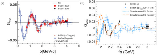 with a normalization A, an inverse oscillation damping parameter B, a momentum frequency C, a phase D and the proton mass and relative momentum and p, respectively. BESIII found a similar effect in the neutron data, as shown as black dots in Figure 4b. Furthermore, the authors perform a simultaneous fit to the nucleon data using a common momentum frequency parameter C for both data sets. This approach can describe the proton and neutron data at the same time and hints that the observed oscillation could have a common reason. Further investigations of this effect could help to establish a global nucleon description.