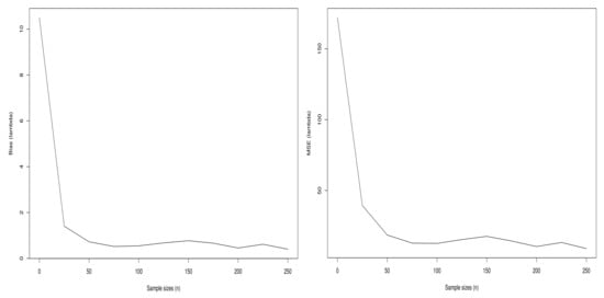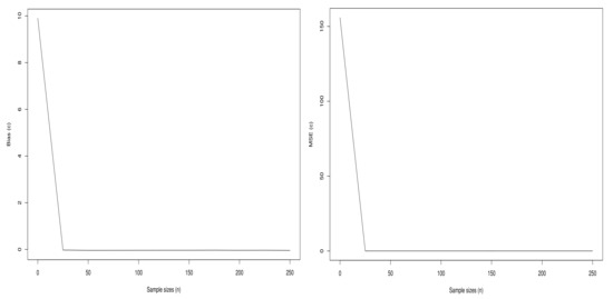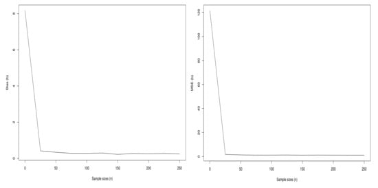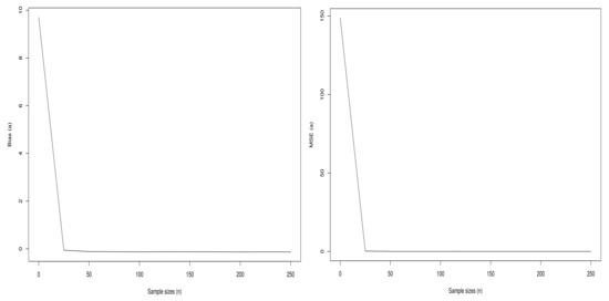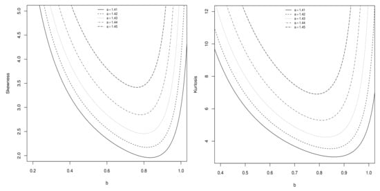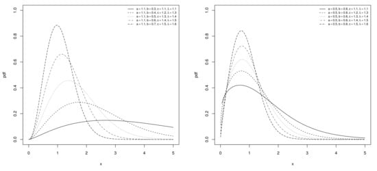 We see that, for the considered values of the parameters, is increasing and convex, whereas is increasing with a tilde shape (concave, then convex, then concave).