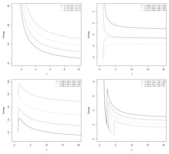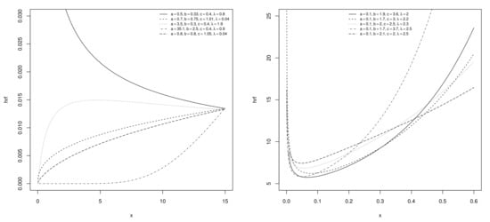 From Figure 2, we see that the corresponding HRF can have constant, increasing, decreasing, bathtub, and unimodal shapes. Moreover, different levels of convexity–concavity are observed. From the statistical modeling point of view, these are very desirable properties. Comparatively, we can observe that the HRF of the Sec-Kum-W distribution can be increasing and concave (for , for instance), which is less immediate for the HRF of the Kum-W distribution (see Figure 2 of [23]).