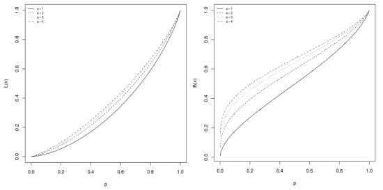 For measuring and visualizing income inequalities, the Bonferroni and Lorenz curves are commonly used. The Lorenz curve, denoted by , is the proportion of total income volume accumulated by those units with an income less than or equal to a certain volume, and the Bonferroni curve, denoted by , is the scaled conditional mean curve; that is, the population’s ratio of group mean income. In the setting of the Sec-G class, and are defined by