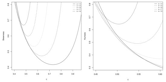 respectively. The plots of these two kinds of curve in the case of the Sec-Kum-W distribution are given in Figure 3 for , , and , and selected values for a.