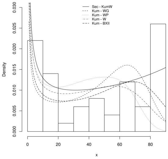 The Kum-W distribution contains many well-referenced distributions. The most notable ones are the Weibull, exponentiated Weibull, and exponentiated exponential distributions (see [26]). Other examples are provided in Table 1 of [23]. The Kum-W distribution supports all five major HRF shapes: constant, increasing, decreasing, bathtub, and unimodal. In the last decade, the Kum-W distribution proved to be one of the more efficient lifetime distributions for data analysis. For further information, see, for instance [27,28,29].