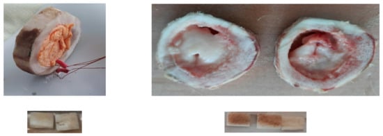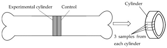 Each thermal mode was studied on three bones. From the diaphyseal part of each bone, two adjacent cylinders were cut with a height of 1 cm and diameter of 3–4 cm. One of the cylinders then underwent the high-temperature treatment while another stayed intact (Figure 1 and Figure 2). Samples in the form of 0.8 × 0.5 × 0.5 cm rectangular blocks were cut from symmetrical areas of the bones then divided into two groups: 1, samples cut from the high-temperature treated bone, 9 samples (3 from each bone); 2, control group, 9 samples (3 from each bone). There were separate control groups for each heating temperature (cut from the same bones as the experimental fragments). Control measurements were conducted at a room temperature of 18–22 °C. Cutting was performed with a water-cooled micro-mill.