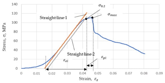 In this case, each value of the load σ was unambiguously associated with the value of strain ε, which made it possible to graph the stress/strain (σ/ε) dependence (see the example in Figure 3). Afterward, the characteristic of the curve was estimated and a straight line was constructed as an approximation of the first steeply increasing section, which has a linear character (Straight-line-1 in Figure 3). Furthermore, there was a point on the graph corresponding to the deviation in the graph from Straight-line-1 by 0.2% (point