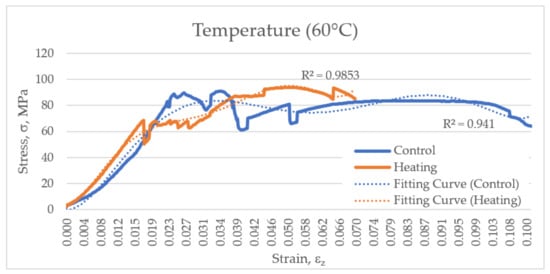 First, deformation curves of the samples heated to 60–100 °C were compared with the control curves (Figure 4, Figure 5, Figure 6, Figure 7 and Figure 8). Each diagram shows deformation curves for an experimental group and a corresponding control group, as well as trend lines. Experimental curves were approximated with a sixth-degree polynomial for all the hyperthermy ranges.