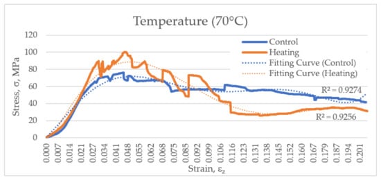There are variations in the stress-to-failure and strain-to-failure curves in the control (non-heated) group, which is typical for bone tissue due to its anisotropism. As shown in the diagrams, at 60 °C, the experimental and control curves are rather close (Figure 4). At 70 °C, rearrangement of the bone tissue under stress was noted (Figure 5). Interestingly, at 80 °C, bone strength against single-axis compression was higher than that in the control group (p < 0.05 as per Wilcoxon T-criterion); similar values of unit strain were noted at higher values of applied stress (Figure 6). The temperature of 80 °C may be an extreme point at which there are critical changes to the properties of strength and elasticity of bone tissue, as at 90–100 °C (Figure 7 and Figure 8), the stress curve is located below the control curve, and at 100 °C, it moves into the plastic deformation area at a stress of 80 MPa (Figure 8). Some researchers argue that the temperature of 80 °C is critical to abrupt changes in properties of collagen [].