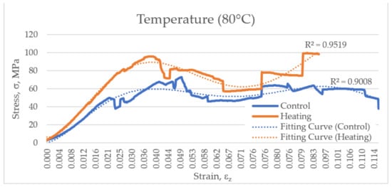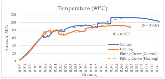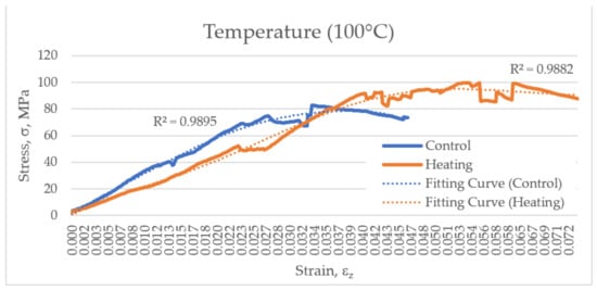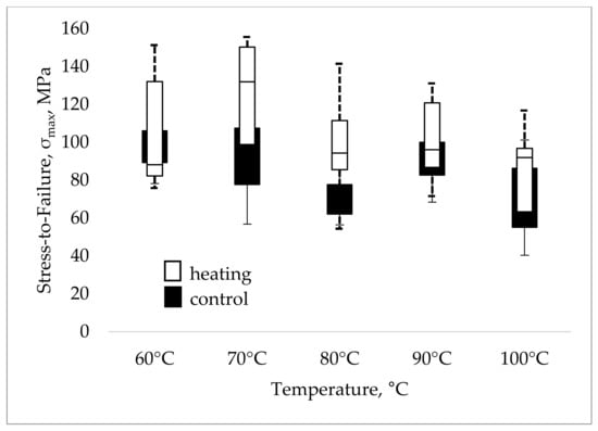 Having been subjected to hyperthermic treatment in the range of 60–100 °C, bone tissue samples endured a higher maximum compressive stress (Figure 9). However, for each separated heating point, no significant differences were discovered between the control and experimental groups (as per the Mann–Whitney test).