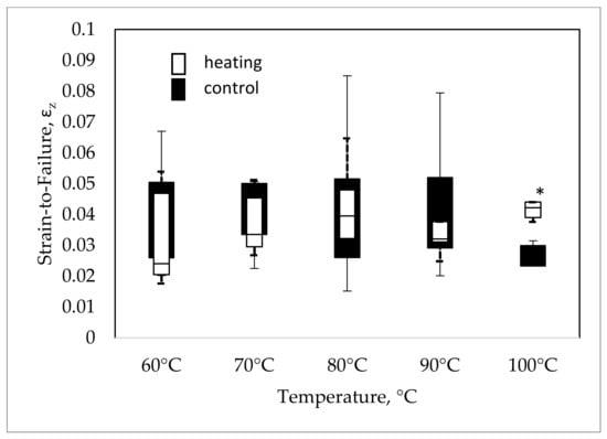 The compressive strength of a bone is largely defined by its density [], which depends on the properties of thermally stable calcium salts. Elastic properties of bone tissue, e.g., under twisting or bending, are largely determined by bone collagen [], which is a temperature-dependent protein, and as such is susceptible to temperatures above 56 °C. Thus, the next parameter for inter-group comparison of the strength properties of bone tissues was the strain-to-failure indicator. In other words, the moment when deformation becomes failure as a result of the stress was studied (Figure 10). This value covers elastic (Figure 11) and plastic (Figure 12) deformation and largely defines the value of the Young’s modulus of elasticity (Figure 13).