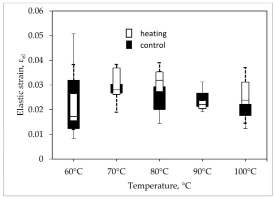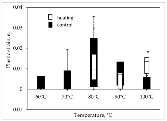 From Figure 10, Figure 11, Figure 12 and Figure 13, we see that statistically significant changes in indicators with respect to controls were evident only at 100 °C. Under this temperature, unit strain increased by 68% (p = 0.003) of the control value (Figure 10), which was due to a four-fold increase (p = 0.02) in the plastic strain values (Figure 12). Plastic strain tended to zero-up to temperatures of 60–70 °C. When heating to 100 °C, the indicator of bone elastic strain increased only by 13% with a significance of p = 0.063.