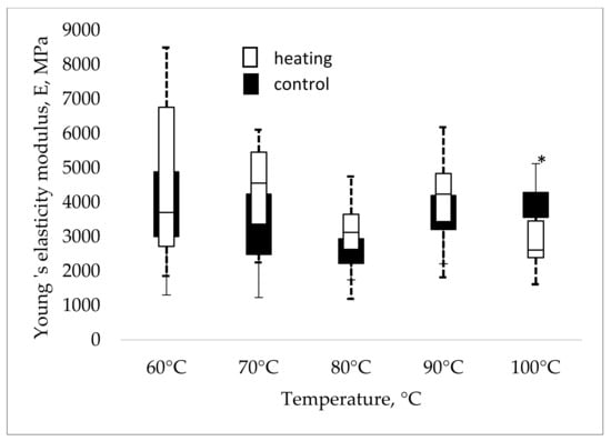 It has been described in several research papers that ex vivo bone fragment heating temperatures in a range close to 60 °C have no practical effect on the properties of collagen fibers [,]. The undulating nature of changes in indicator values leads us to suspect that, under gradual heat, collagen may change its state, transitioning to a sol-gel conformation as a result of the release or absorption of water molecules, thus suggesting periods of fluidity or brittleness of protein fibers. Following this change in state is a growing coagulative (i.e., dry) necrosis (denaturation) of bone cells and the destruction of collagen and other bone tissue proteins [], leading to the shortening and the increased fragility of collagen fibrils, and resulting in a corresponding reduction in the elastic properties of the bone. According to our data, this process becomes critical to bone biomechanical properties at 100 °C, when the Young’s modulus of pre-heated bone samples falls to 68% of the control level (p = 0.034, Figure 13).