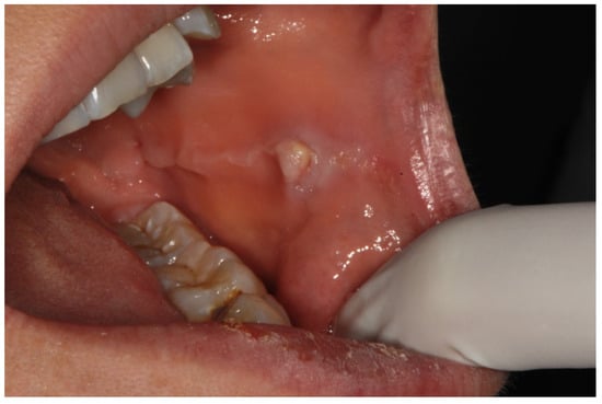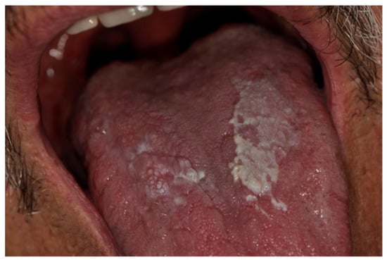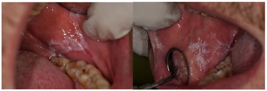 According to the geographical region and type of leukoplakia, this pathology can be present in the oral cavity in different configurations. Mostly, it can be seen bilaterally on the buccal mucosa or on the floor of the mouth [7,43,45] (Figure 5).