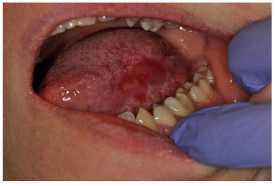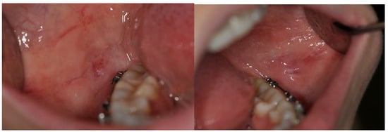In our study, oral lichen planus (OLP) and oral lichenoid lesions (OLL) were grouped as oral lichenoid diseases because some of our patients had been using different medications that were described in the literature as potentially causative for OLL development. In our research, the most frequently recognized lichenoid diseases/lesions were white forms (11.8% of all medical diagnoses), and additionally, in 2.2% of all made diagnoses an erosive/bullous forms was recognized, making it altogether 14%. For women, this prevalence was even higher—17.2%. It is worth emphasizing that these oral lesions were accompanied by the involvement of the other sites such as: skin or nonoral mucosa, only in about 6%, and have been under clinical control for at least 8 years. In other studies [34,35,36,37], the prevalence of lichen lesions was only at the rate of 1.3%, 1.2% and 0.8%, accordingly. However, it should be pointed out, that cited authors described the India population from different geographical regions, cultures and habits. In turn, a higher prevalence of OLP lesions, at the level of 2.3%, 2.5%, 3.5% and 5.6%, was observed by authors from Slovenia [38], Italy [39], Northern Finland [40] and from Egypt [4], respectively. In the article by Oivio et al. [40], the birth cohort study of 1961 participants, oral lichenoid diseases were described as more frequent in men. Oral lichenoid diseases, both OLL and OLP, mainly manifest as symmetrical lesions, on both sites of the oral cavity. However, when the triggering factor of OLL is a local irritation (mechanical trauma and toxic factor), the lesion is observed only on adjacent oral mucosa [5,25] (Figure 2 and Figure 3).