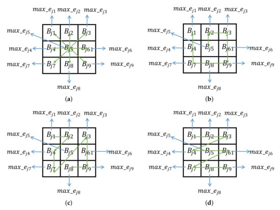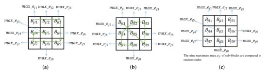 where denotes the largest value in the l-th sub-block and the block has k eigenvalues. The largest eigenvalue of adjacent image sub-blocks is arranged and combined in light of the specific arrangements to obtain an 8-bit binary hash code. The arrangements in this method are displayed in Figure 1. If the arrangement Arr.1, as shown in Figure 1a, is selected in the process, the hash code is acquired by Equation (3). When another arrangement (Arr.2 or Arr.3 or Arr.4) is selected, the function is calculated according to Equation (4).