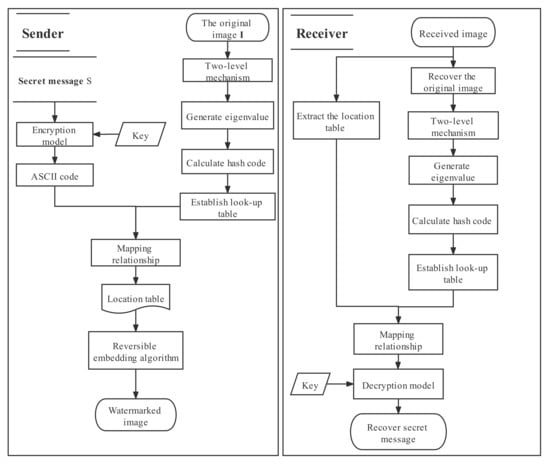 Before the secret message is hidden, the new encryption model is designed to enhance the security of secret data first. To increase the diversity of hash codes, the original image is divided into two sub-images using the two-level mechanism, and the mapping relationship formed by the look-up table established by the image blocks of the sub-image and the secret message is formed to realize the coverless hiding of the secret data. Although the hiding process does not change the original image, it needs to generate a corresponding location table. Considering that the location table needs additional storage and transmission, the paper adopts PEE to realize the second embedding of the location table. After receiving the watermarked image, the receiver can extract the location table and recover the original image. After obtaining the original image, the same look-up table can be established, and the encrypted secret information can be extracted according to the mapping relationship. The secret message can be recovered through decryption model with the same key. Figure 2 shows the framework model of the proposed algorithm. Due to the parameters used in the sender and receiver are the same, the designed model is symmetric.