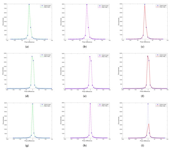 The PDH analysis with different images: (a–c) are the results in “Lena”, (d–f) are the results in “Pepper”, and (g–i) are the results in “Plane”.