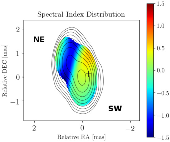 The unambiguous identification of the core with the SW component was made possible by the 43-GHz VLBA image published by [27], as CTD 135 was included in the sample of 124 radio AGN observed in their survey. A naturally weighted image prepared from the same data in difmap [28] is displayed in Figure 1. We constructed the spectral index image of the source and show it in Figure 2. It is based on the 43-GHz data obtained on 18 January 2016 [27] and the 15-GHz MOJAVE data from 19 December 2015. The epoch of the latter was chosen to be the closest in time to that of the 43-GHz image, to minimize the effect of possible variability. The colour scale indicates the spatial distribution of the two-point spectral index ; it is defined following the convention , where S is the brightness of the given image pixel and the observing frequency. The spectral index image was constructed using the vimap [29] tool that allows us to properly align the images made at two different frequencies.