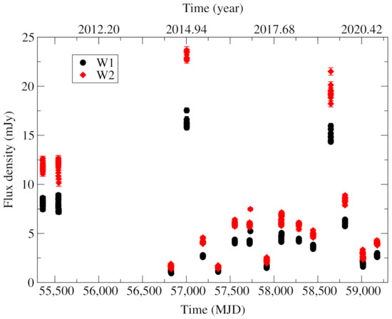 We downloaded the WISE single exposure data (http://irsa.ipac.caltech.edu/Missions/wise.html, accessed on 19 December 2021). Following the instructions of the Exploratory Supplement Series (https://wise2.ipac.caltech.edu/docs/release/allwise/expsup/sec3_2.html, accessed on 19 December 2021), we discarded measurements of bad quality. These involved data (25 measurement points) that have a profile-fit goodness value of ≥3 in either the W1 or W2 bands, indicating that a point-source model was not able to adequately describe the data (e.g., an image artifact was affecting the measurements). Then, we converted the magnitude values to flux densities and constructed the light curves shown in Figure 3 and Figure 4.